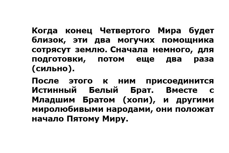 Индейцы Хопи описывают в своих предсказаниях время, которое будет предшествовать библейскому апокалипсису. Самое интересное, что описание коренных народов Америки очень похоже на хрестоматийные религиозные источники. Здесь опять же стоит упомянуть, что коллективное бессознательное всех народов мира содержит в себе одни и те же архетипы, а значит предусматривает реализацию одних и тех же программ. Именно поэтому в источниках Хопи есть упоминание и о Белом Брате, появление которого в настоящее время ожидает весь мир. Это и есть архетип Спасителя, который также известен различным религиям.