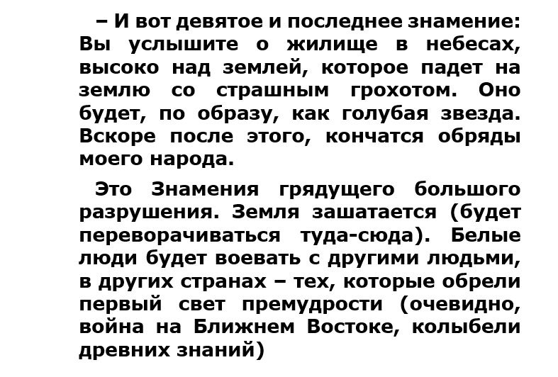 Если обобщить весь имеющийся материал предсказаний и пророчеств коренных народов Америки про период последних дней, а также информацию о появлении архетипичной фигуры воина, который спасет всю цивилизацию от разрушительных бедствий и тотального уничтожения, то можно указать следующие основные моменты: