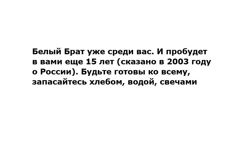 Однако, самым интригующим событием среди описанных выше фактов, стало то, что один из видных представителей индейцев Хопи, то есть достаточно почитаемый и уважаемый в этой среде старейшина Мартин Гашвесеома еще в 2003 году указал на тот факт, что Истинный Белый Брат уже среди нас. Данное пророчество было высказано в отношении России. Об этом же свидетельствуют и другие предсказания различных мировых источников. Получается, что все ключевые факты указывают на Россию, как на страну, где появится данный политический лидер, обладающий новыми информационными технологиями, которые позволят ему естественным путем прийти к политической власти.